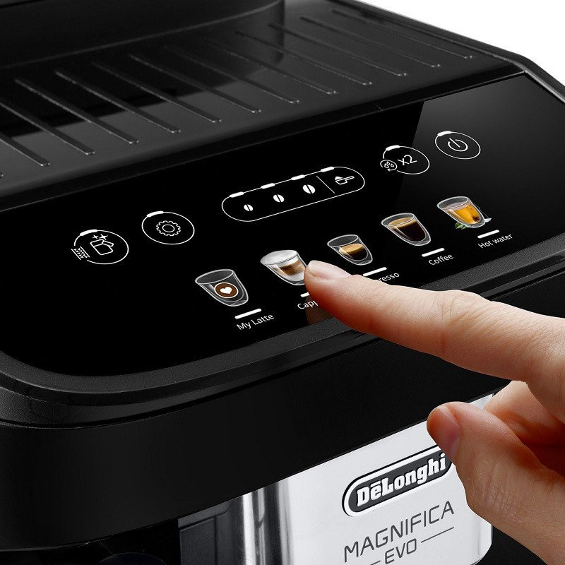 S kávovarom De´Longhi Magnifica Evo si vynikajúcu kávu pripravíte jedným tlačením tlačidla v pohodli vášho domova. Magnifica Evo nie je len talianske espresso s plnou chuťou, ale na výber máte až 5 rôznych receptov. Objavte intuitívne ovládanie s farebnými tlačidlami na priamu voľbu svojho obľúbeného nápoja. Vďaka jedinečnému systému napeňovania mlieka "Latte Crema" bude vaša mliečna káva chutiť dokonale. S novou funkciou "My Latte" si naviac môžete svoj mliečny nápoj prispôsobiť podľa vašich preferencií a uložiť do pamäte.
